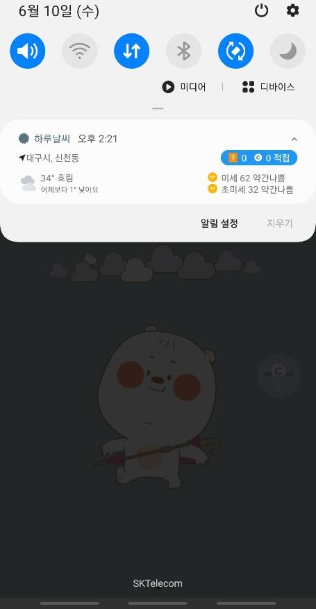 상태바를 내리면 내 위치 정보에 맞춰져서 현재 날씨와 미세먼지 그리고 초미세먼지 농도까지 보기 쉽게 알려드리고 있습니다.